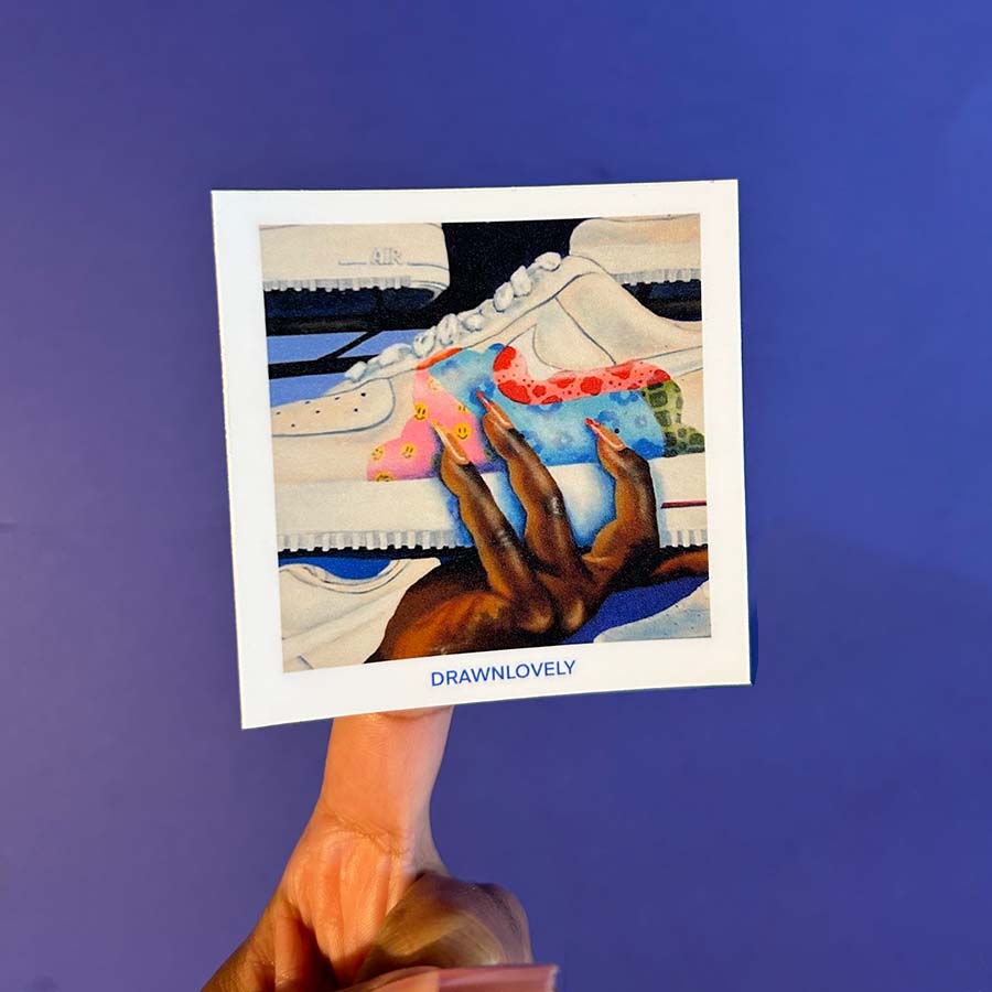 This sticker is a reproduction of the acrylic painting, "She Exudes Creativity" where every spot she touches on the shoe comes to life with the patterns and boldness of her nails.